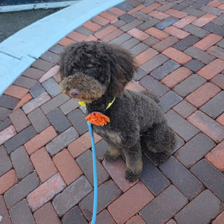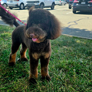 Willow Rose is a chocolate phantom mini goldendoodle with amber color eyes. She is playful and very sweet. She is extremely intelligent and very food motivated. Her favorite part of the day is meal time. She has a bit of sassiness, is very independent and confident. She is 29lbs and approximately 18 inches at her withers